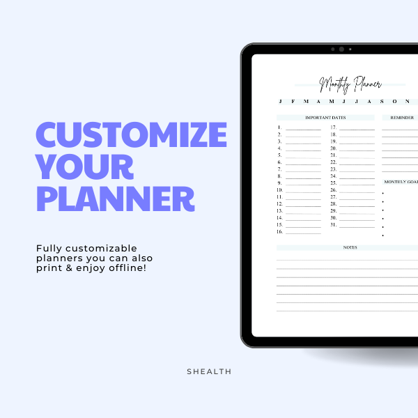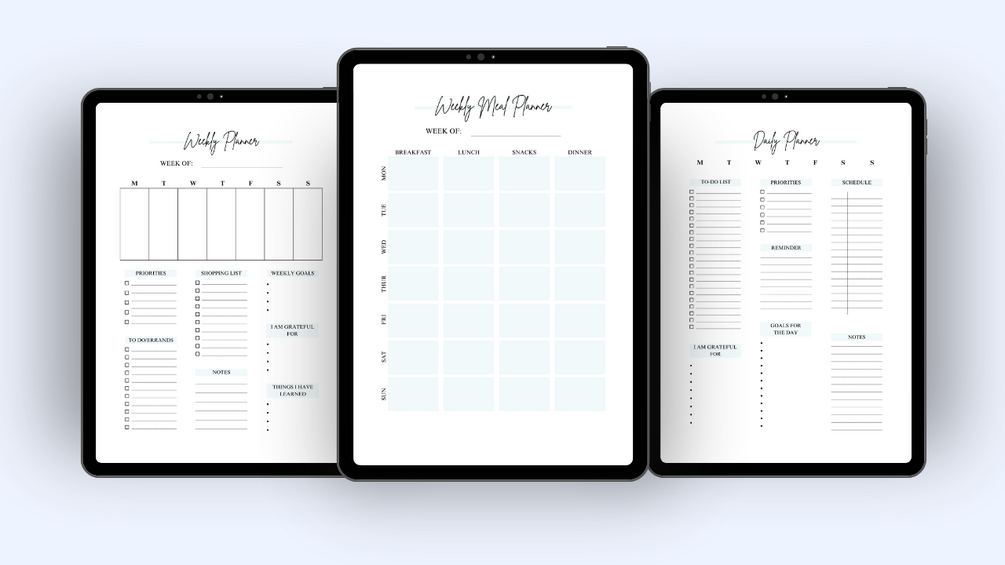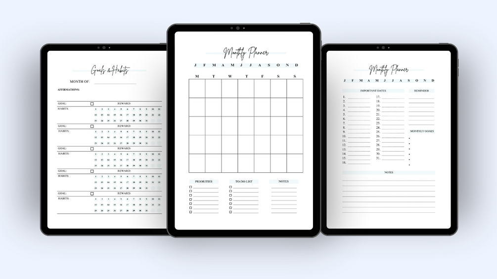 Goals & Habits Tracker, 2 Monthly Planners, Weekly Planners, Weekly Meal Planners, 31 Daily Planners, 31 Daily Notes Pages