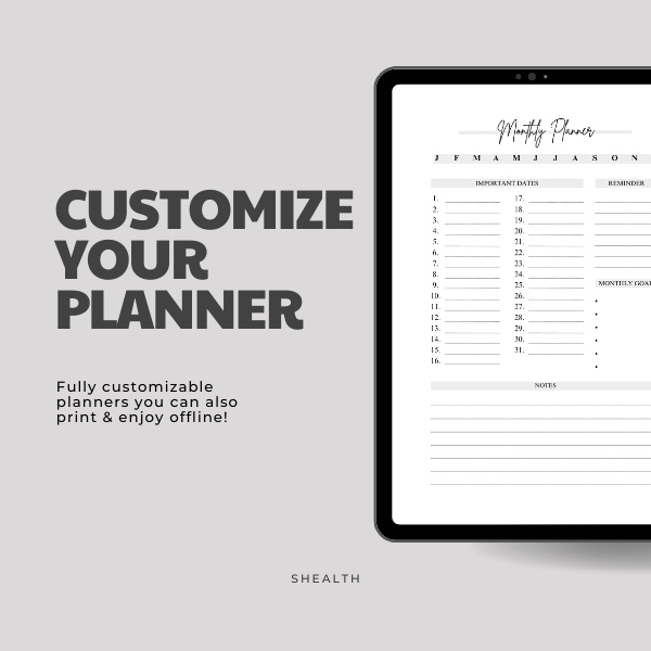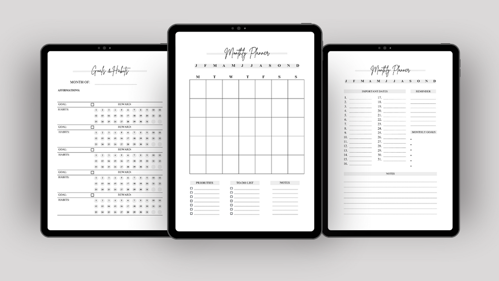 Goals & Habits Tracker, 2 Monthly Planners, Weekly Planners, Weekly Meal Planners, 31 Daily Planners, 31 Daily Notes Pages