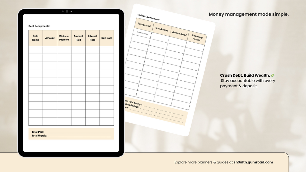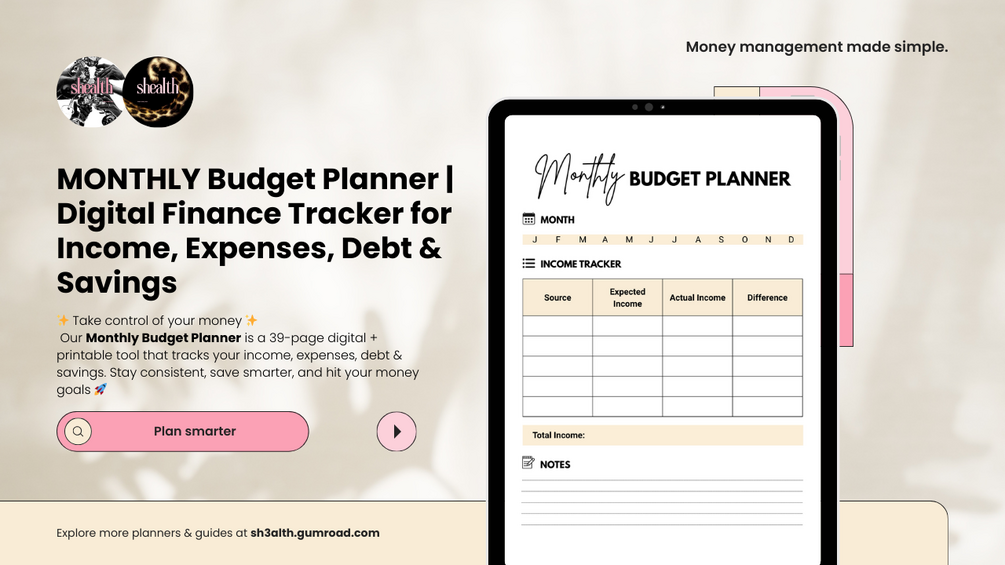 Take control of your money, reduce stress, and finally achieve your financial goals. This 39-page Monthly Budget Planner is the ultimate tool to track your income, expenses, savings, and debt — all in one place. Whether you’re saving for a big purchase, paying down debt, or simply trying to stop overspending, this planner will keep you organized, consistent, and motivated.
