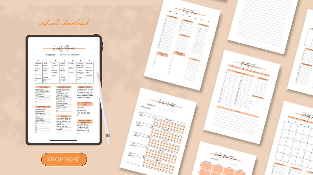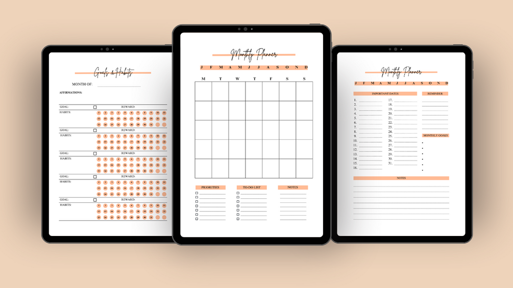 Goals & Habits Tracker, 2 Monthly Planners, Weekly Planners, Weekly Meal Planners, 31 Daily Planners, 31 Daily Notes Pages